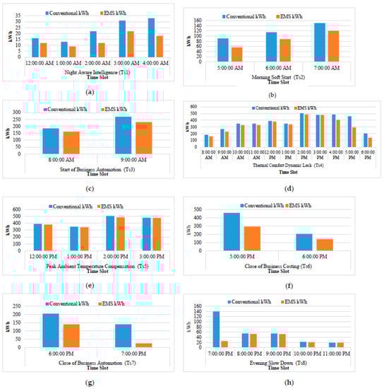 Electricity consumption comparison of each time slot. (a) Electricity consumption comparison of Night Aware Intelligence (TS1), (b) Electricity consumption comparison of Morning Soft Start (TS2), (c) Electricity consumption comparison of Start of Business Automation (TS3), (d) Electricity consumption comparison of Thermal Comfort Dynamic Lock (TS4), (e) Electricity consumption comparison of Peak Ambient Temperature Compensation (TS5), (f) Electricity consumption comparison of Close of Business Costing (TS6), (g) Electricity consumption comparison of Close of Business Automation (TS7), (h) Electricity consumption comparison of Evening Slow Down (TS8).