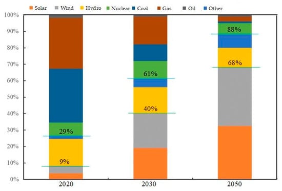 As the process of new power systems continues to advance, a high percentage of wind power and photovoltaic power becomes an important part of the power supply. The strong uncertainty and volatility of new energy will have a great impact on the power supply and demand of the power system [13]. According to statistics, global energy trends are shown in Figure 1. Wind and PV will be the dominant energy sources in 2050, accounting for 68% of all society’s electricity generation. Since both PV and wind power have poor continuity, geographical constraints, and are prone to surplus or shortage, they will cause the security and reliability of the power system to be further threatened.