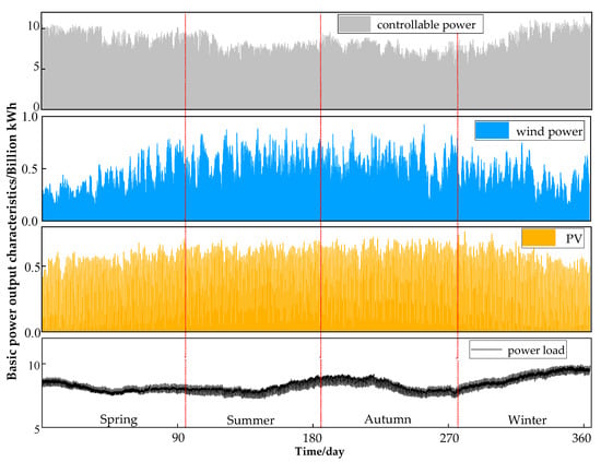 Summer cooling and winter heating make China’s electricity consumption significantly higher in summer and winter than in spring and fall. Wind and photovoltaic power generation is highly uncertain due to regional and weather effects. Wind power output is at peak in spring and autumn, and photovoltaic output is at peak in summer and autumn [16,17,18]. According to the power balance analysis, wind-PV complementarity can reduce the impact of new energy seasonality to a certain extent. However, the seasonal power distribution of new energy does not match the power demand. There is a seasonal power-balance problem in summer when the power load is high and new energy generation is low [19]. In order to guarantee the reliable supply of energy to the new power system, it is necessary to determine the timing of the deployment of long-term energy storage, i.e., what percentage of the power system is penetrated by new energy sources. Therefore, the total generated active value (hourly level) of thermal, wind power, hydropower, photovoltaic, and nuclear power in China’s power grid for 2018–2020 is used as the basis. In addition, wind power and photovoltaic power are considered as uncontrollable power, and hydropower, nuclear, and thermal power are considered as flexible controllable power. In order to attenuate the impact of weather changes on wind power and PV output as much as possible, the wind power, PV, controllable power and power load data from 2018–2020 were summed up and averaged as typical data, and the results are shown in Figure 2. As can be seen, the relationship between electricity supply and demand is largely consistent with the seasonality analyzed in the previous section.