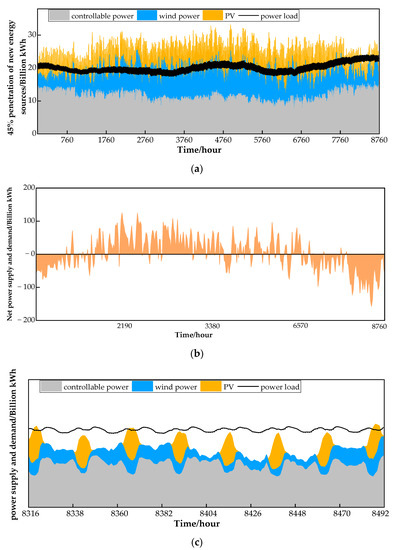 (a) Electricity supply and demand in a power system with a 45% penetration of new energy sources; (b) Net power supply and demand in a power system with a 45% penetration of new energy sources; (c) Power deficit in a typical winter week.