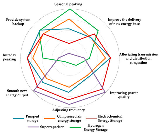 There are many types of energy storage and various technical routes, and the application scenarios also have their own focus. Many factors affecting the adaptability of energy storage cannot be quantified. Most of the relevant studies have focused on the economic or technical adaptability of energy storage. The performance of various types of energy storage technologies under different application scenarios is compared from three levels of analysis: technical, economic and safety, as shown in Figure 5. Combining Figure 4 and Figure 5, hydrogen energy storage has the advantages of high energy density, large storage scale, and the ability to cross seasons, making it the optimal solution for participating in the long-term energy storage of new power systems. In order to have good reliability and stability in the new power system when the share of new energy reaches 45%, hydrogen storage needs to be commercially promoted in the next 10–30 years, which is significant for building a new power system.