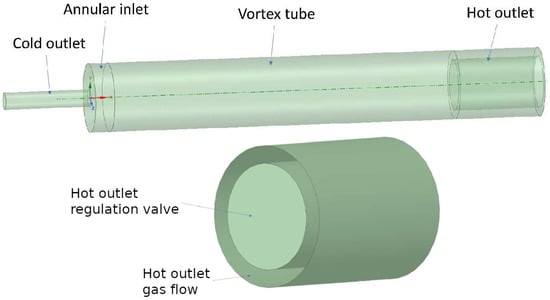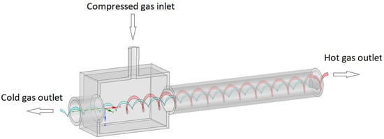 The reduction of fossil fuel consumption is a priority for the industry stimulated by the worldwide policies to reach a climate-neutral scenario in 2050 [1]. In these circumstances, natural gas (NG) suppliers are reconsidering the procedure to accommodate the gas from the distribution grid to the consumption points’ requirements. This adaptation is carried out in a pressure reduction station where the NG is throttled to liberate the excess pressure. However, based on the Joule–Thomson effect, the NG temperature plunges, leading to the unsuitable hydrates formation [2,3]. To avoid this issue, the NG is traditionally preheated before the expansion by means of a boiler, which consumes part of the inlet gas. Thus, efforts have been focused either on the reduction of the NG boiler consumption [3] or a replacement of this device by, e.g., solar collectors [4], geothermal exchangers [5] or turbo-expanders [6]. In this context, using Ranque–Hilsch vortex tubes (VT) seems a promising alternative since energy input is not required to increase the gas temperature before the expansion. This device is able to generate two separated streams at different temperatures when a compressed gas flow is injected tangentially. The cold stream exits from the central outlet nearby the inlet, and the hot stream is exhausted from the exit at the other side of the tube. Figure 1 represents the flow distribution inside a dual path or counterflow VT. Although single path VT can also be used, some researchers report that this configuration is less efficient than the counterflow one [7]. The main advantage of a VT is its simplicity of design and lack of moving parts. Thus, power input is not required and its maintenance is greatly simplified. Based on these advantages, the VT can be considered an excellent choice for heating and cooling applications, e.g., heating, ventilating and air-conditioned (HVAC), cooling of electronics, gas liquefaction or gas heating [8,9].