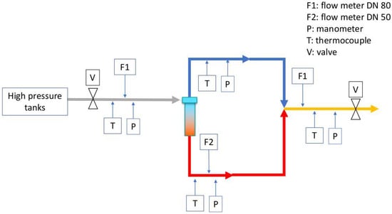 The experimental tests were done with a VT whose nominal flow is 74 Nm/h (GR1, 600 mm in length and 31 mm in diameter). A schematic of the experimental setup is shown in Figure 2. In the field test, an additional VT with double nominal flow (GR2, 710 mm in length and 40 mm in diameter) will be used. This was not tested in the laboratory due to the difficulty to achieve enough gas supply. However, both VTs have the same design and are expected to behave analogously under the right conditions of pressure ratio and flow rate. The objectives of the tests were: