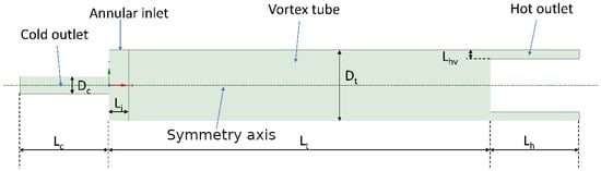 The flow of gas enters the tube with a swirl momentum due to the angle . This parameter recreates the orientation of nozzles in real tubes. The swirl is a result of the radial and tangential components of the velocity, while the axial component is set to zero. The cold and hot outlets have been lengthened to allow a developed outlet flow profile, which helps to stabilize the numerical solution. The resulting 2D geometry is depicted in Figure 4, though only half of it had to be simulated thanks to symmetry respect to the axis. “L” stands for length, “D” for diameter, and subscripts “t”, “h”, “c”, “i”, “hv” stand for “Vortex tube”, “hot outlet”, “cold outlet”, “inlet” and “hot valve”, respectively. The dimensions of GR1 in the simulation are gathered in Table 3.