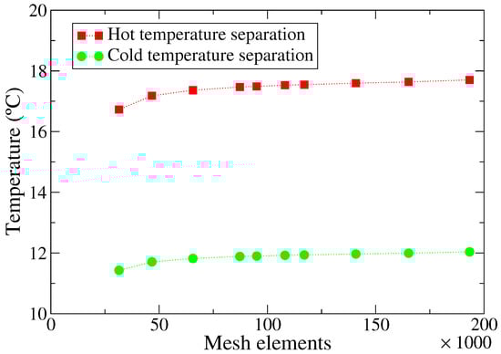 Before the parametric sweep, it is necessary to ensure that the used mesh is good enough to trust its results. For that purpose, a mesh sensitivity analysis was performed. Since the above-mentioned geometric parameters are unknown, generic values were used, mm, mm, . As the monitored variables to assess the convergence of the mesh, temperature separation in cold and hot outlets were selected, since they are the most important performance indicators of the VT. The results for the analysis are shown graphically in Figure 6. In Table 4, the relative differences between the results of a mesh and its previous one are shown. Given the low variation for values higher than ∼90 k cells, the selected mesh is the one with 95,064 elements. The mesh comprises quadrilateral cells with a few triangular cells. The maximum cell size is mm while at the inlet it decreased to mm, and at the exits it is mm in the hot and mm in the cold. The average aspect ratio is very close to 1 indicating that the mesh has a high quality.