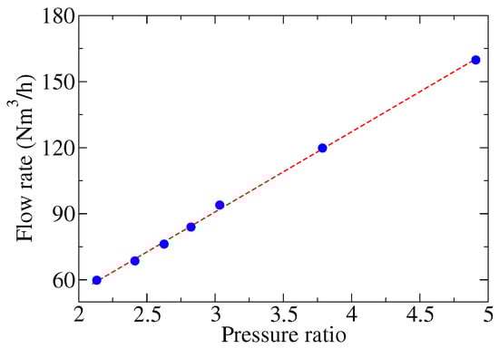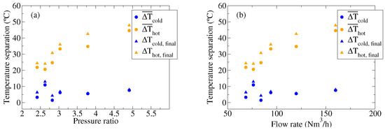 Figure 7b shows the same information as a function of the gas flow rate. The gas mass flow rate increases linearly with the pressure ratio (see Figure 8); therefore, the temperature separation follows the same trend as with the pressure ratio.