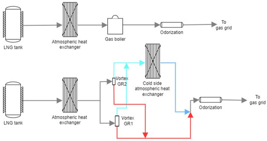 Diagram of a usual regasification facility (top) and the vortex facility (bottom).