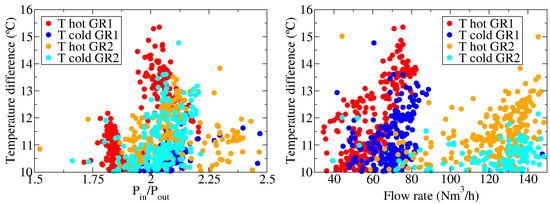 Regarding the maximum temperature differences (see Figure 12), it has been observed that the largest ones are registered when the inlet flow rate is close to the nominal flow. This is especially noteworthy in vortex GR1, where the maximum temperature differences are the highest at 73 Nm/h, reaching the largest hot temperature difference at C, and the largest low temperature difference at C, with pressure ratios always above 2. It is expected, according to laboratory results, that when operating with higher pressure ratios larger temperature differences should be reached. In the case of vortex GR2, the largest temperature differences are C for the hot side and C for the cold side, for an inlet flow of Nm/h and a pressure ratio above 2. A larger temperature difference should also be expected in this case for higher pressure ratios, as for the GR1 case. Additionally, it is also worth noting that the vortex should always be operated with pressure ratios () above 2, as this also determines the amount of energy that can be transferred to the gas in the form of heat. The higher this pressure ratio is, the larger temperature differences should be observed. Summarizing, the largest temperature differences should be expected when the inlet flow rate is close to the nominal flow and the pressure ratio is as high as possible.