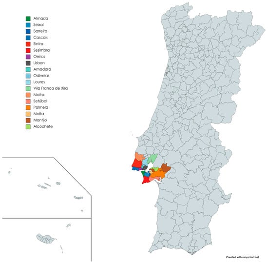 As mentioned earlier, the initial stage of our empirical investigation involves data collection. Therefore, this subsection presents the data/variables used in our empirical investigation of 18 Portuguese municipalities within the Lisbon Metropolitan Area for 2014 and 2020. The municipalities included in the study are Alcochete, Almada, Amadora, Barreiro, Cascais, Lisbon, Loures, Mafra, Moita, Montijo, Odivelas, Oeiras, Palmela, Seixal, Sesimbra, Setúbal, Sintra, and Vila Franca de Xira (see Figure 3 below).