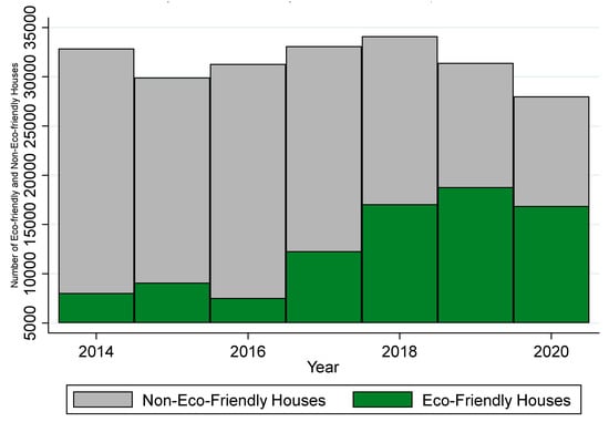 In the Lisbon Metropolitan Area, there has been a notable surge in the number of eco-friendly houses that meet high energy efficiency standards like A+, A, B, and B-, according to Koengkan and Fuinhas [71]. Specifically, there were only 8047 eco-friendly houses in 2014, but by 2020, this number had more than doubled to 16,881. In contrast, the number of non-eco-friendly houses with lower energy efficiency certifications, such as C, D, E, and F, was 32,874 in 2014. However, by 2020, this number decreased to 28,017, reflecting a positive trend towards eco-friendliness. (see Figure 4 below).