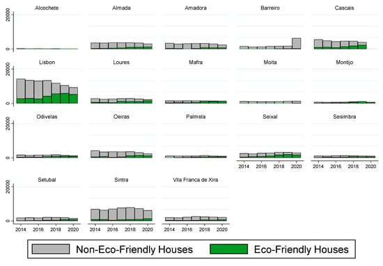 Number of Eco-friendly and Non-friendly houses in Lisbon Metropolitan Area Municipalities from 2014 to 2020. This graph was created by data from SCE [92].