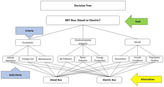 To make a comparison between the two BRT models (battery electric bus and diesel bus), we adopted the analytic hierarchy process methodology (AHP). The AHP methodology aims to assist in the decision-making of complex problems based on the hierarchical importance of one criterion over the others [52].