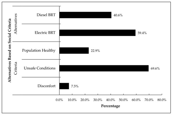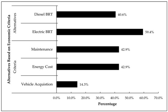 The AHP methodology allowed us to adopt a quantitative methodology to analyze the advantages of the adoption of battery buses in BRT systems, showing decision-makers the feasibility of such adoption while considering the impacts on three societal pillars: economic, environmental, and social. And this is the novelty of the study. We could find studies using MCDM techniques to analyze the operation process of BRT [80], but none of them compared battery and diesel bus adoption.
