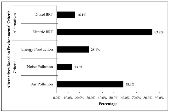 It was possible to verify an advantage of electric buses (60.9%) over diesel ones (39.1%). The results show that the economic impact (13.5%) on the best energy matrix is smaller than the environmental impact (28.1%) and the social impact (58.4%). Thus, it is possible to infer that the higher cost of electric buses can be amortized due to the other benefits, mainly the social ones [68].