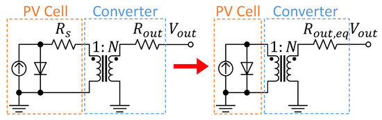 Figure 2 shows a generic DC-DC voltage converter with a PV cell connected at the input. The simplified equivalent circuit of the PV cell is called the 1D1R model and consists of a current source, a diode, and a series resistor () [43]. The electrical properties of the PV cell change dynamically as a function of illuminance [44]. For example, can vary from 2 k to 2.8 k when the illuminance in a commercial PV cell of 20.2 cm changes from 700 lux to 400 lux [8].