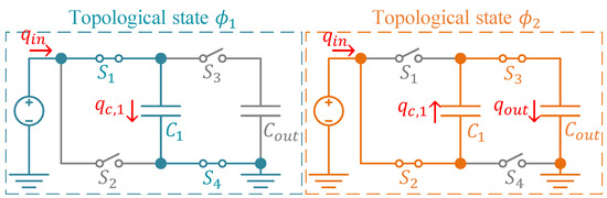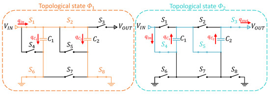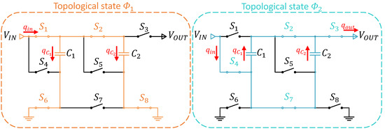 As an example, consider the circuit of a voltage doubler shown in Figure 3. In the topological state , the charge flows from the voltage source to the flying capacitor . In the topological state , is connected in series with the input voltage, and the charge flows from to the buffer capacitor .