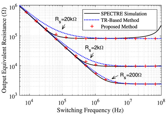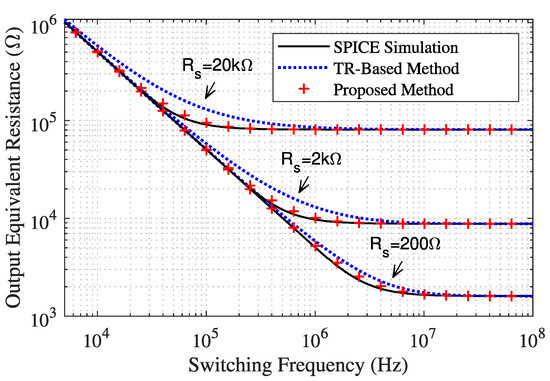 There are some state-of-the-art techniques for modeling SC converters in the literature. Charge flow analysis is a method that provides very accurate results using the asymptotes of the Slow Switching Limit (SSL) and Fast Switching Limit (FSL) to model the equivalent output resistance () [17,42]. However, this method does not take into account the effects of the source resistance . In addition, the inclusion of for modeling in SC converters may have lower accuracy when higher values of are considered.