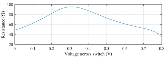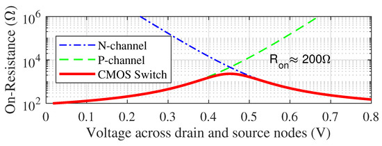 To validate the method with real nonlinear components, CMOS transmission-gate switches are used in the doubler SC converter. The MOSFETs are from a 180-nm CMOS technology and have a channel length of 0.18 m and eight fingers with a width of 2 m and 5.4 m for the NMOS and PMOS, respectively. The simulated on-resistance of the CMOS switch is shown in Figure 7.