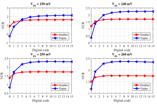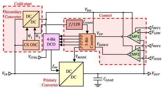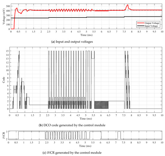 The primary converter is the core of the entire system. It receives as input the voltage generated by the PV cell () and provides as output the regulated 400 mV output voltage (). For this purpose, a control signal selects the proper VCR, and the signal controls the operating frequency of the switches.
