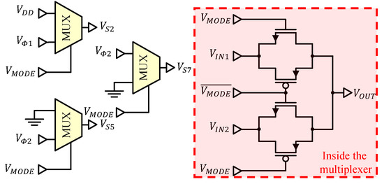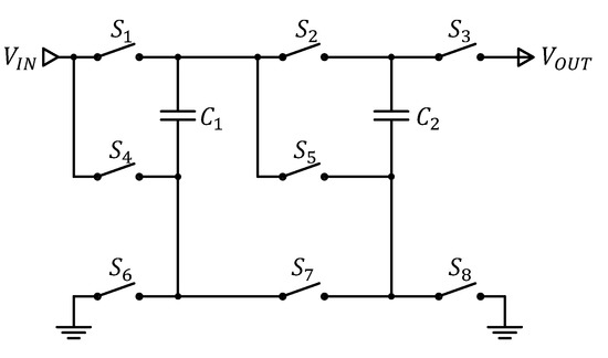 A multitopology converter is used to obtain different voltage conversion ratios (VCRs) [44]. The use of multiple VCRs can affect the output impedance of the converter because the output equivalent resistance of the converter increases exponentially with the number of stages [17]. To avoid large output impedance, we limited the VCRs of the primary converter to 2 and 3. To achieve these VCRs, a series-parallel doubler and tripler is used. The schematic of the implemented dual-mode (2× and 3× ) SC converter is shown in Figure 10. It consists of eight CMOS switches and two flying capacitors ( and ).