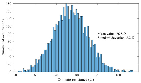 The switches were implemented as CMOS transmission gates using low-VT transistors with W/L ratios of 5/0.25 and 17.5/0.3 for NMOS and PMOS transistors, respectively, also using 10 fingers each. Figure 13 shows the on-state resistance () according to the voltage of the CMOS switches used in the primary converter implementation. To evaluate the effect of process variability, the average of the CMOS switches was evaluated using 5000-run Monte Carlo analysis, considering process and mismatch parameters. Figure 14 shows the frequency histogram of in which the obtained average resistance is 76.8 with a standard deviation of 8.2 .