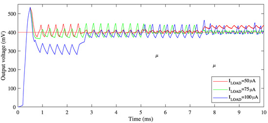 The settling time of the proposed DC-DC converter was measured according to the start-up time, since no significant delay was observed during the transient simulation with the variation of input voltage and output load. Based on Figure 24, the measured settling time is 0.69 ms, 0.63 ms, and 0.60 ms for the current load of 50 A, 75 A, and 100 A, respectively. Since the proposed circuit aims to generate a stable voltage of 400 mV, we also estimated the line and load regulation, which are the main characteristics of a linear voltage regulator. A line regulation of 13% and load regulation of 0.48% were estimated. These values are higher compared to commercial linear regulators, but this was expected due to the lower output voltage level and input voltage range in the target application. In addition, ultra-low voltage and ultra-low-power circuits targeting autonomous batteryless devices are expected to have lower performance compared to circuits designed to operate at standard supply voltages (1.8 V for this 180 nm CMOS process).