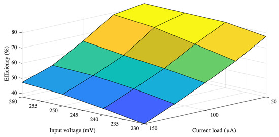 The average module of the instantaneous power at a steady state is used to measure the efficiency of the SC converter. Figure 25 shows a surface of steady-state efficiency of the SC converter in the function of input voltage and current load. The peak efficiency of the converter is 81.6% at an input voltage of 260 mV and a current load of 50 A. The efficiency drops to 40% as the input voltage decreases and the current load increases.