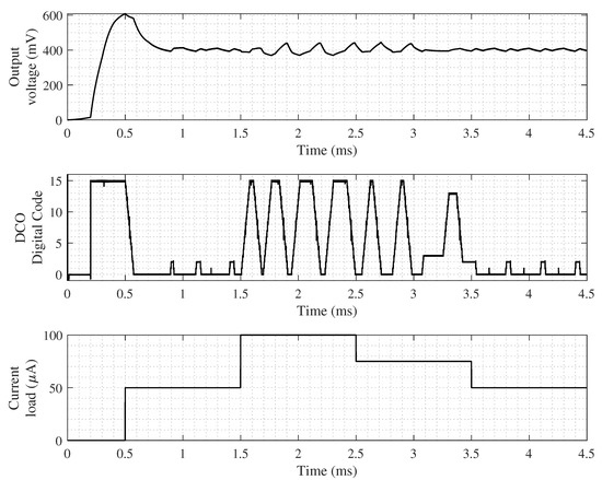 A transient simulation at a schematic level of an abrupt variation in current load is illustrated in Figure 26. The output voltage remains stable through the abrupt load changes. Similar to the tests above, the DCO digital code is at its lower limit for a low load of 50 A, and for high loads it begins to rise and fall until stability is achieved.