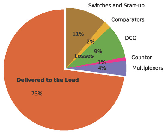 Figure 27 shows the distribution of power consumption on the energy-harvesting system considering an input voltage of 250 mV and a load of 30 W. In this scenario, 73% of the energy is delivered to the load. The remaining 27% of the energy consumed by the DC-DC converter is distributed among the digital counter (less than 1%), the comparators (2%), the multiplexers (4%), the DCO (9%) and the losses in switches and in the cold start-up circuit (11%).