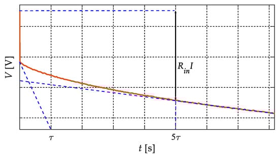 In this work, the procedure to obtain the discharge OCV-q curve was performed by discharging the battery at the nominal current rate (1C) to speed up the tests, as performed in []. Therefore, it was essential to correct the discharge voltage curve by eliminating the voltage drop over the total internal resistance of the battery. Thus, it was necessary to estimate the value of such an internal resistance. For the sake of simplicity, as assumed in [], the battery’s internal resistance was considered to be quite constant as a function of the absolute state of discharge. Moreover, assuming the battery was fully charged, when the discharge at constant current started, different phenomena, with different time constants, led to an electrical transient. To obtain the total battery’s internal resistance, the entire electric transient had to be extinguished. To do this, we had to consider a proper time interval related to the largest time constant τ, which corresponds to the diffusion process of the lithium/lithium ions into the electrodes and electrolyte. Through the procedure reported in [,], it was possible to identify that time interval, considered to be five times the largest time constant τ, in the first part of the discharge voltage curve (Figure 2). Therefore, the resulting voltage variation related to that time interval was estimated. By calculating the ratio between that voltage variation and the current step, the battery’s internal resistance was calculated, and the discharge voltage curve was corrected, obtaining the discharge OCV-q curve. Finally, the part of the OCV-q curve corresponding to the considered electric transient was eliminated to avoid errors in the following analysis.