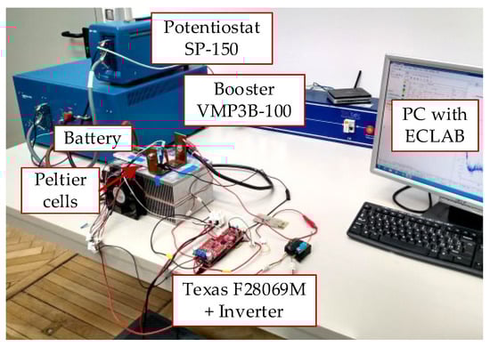 Figure 3 shows the experimental setup that was composed of a potentiostat (SP-150) connected to a 100 A booster (VMP3B-100). Both instruments are manufactured by Biologic Science Instrument, and they are connected to a PC via an ethernet cable. The PC controlled them through the EC-Lab software. The 100 A booster was connected to the battery cell under test through a power cable.