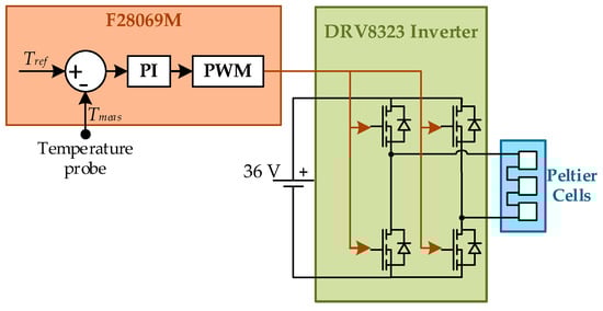 The battery cell arrangement consisted of a heatsink, two fans, three Peltier cells, a dc voltage source, a temperature probe, and a Texas Instrument DRV8303 inverter controlled by an F28069M controller board. The three Peltier cells were put between the battery cell under test and the heatsink to maintain the battery temperature as uniform and constant as possible at 25 °C during the discharge voltage curve measurements. This was carried out to avoid changes on the OCV-q curve due to temperature variation. To do this, they were connected in series and powered by the inverter, which was, in turn, controlled by the F28069M with a PI controller. Finally, the inverter was supplied using a dc voltage source. Figure 4 shows the schematics of the temperature control.