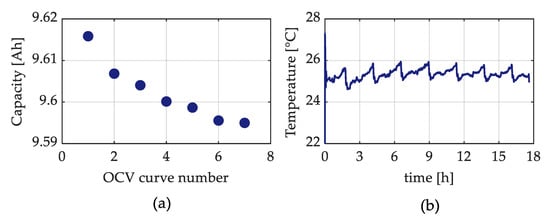 According to the test procedure reported in the previous section, a total of twelve calendar aging phases were evaluated at specific time intervals: 0th, 35th, 70th, 99th, 136th, 205th, 273rd, 344th, 437th, 682nd, 743rd, and 997th day. The entire duration of the testing period was about 1000 days. Among these twelve tests, a subset of four (at the 0th, 205th, 437th, and 997th day) was selected and used to tune the proposed aging model. As stated before, for each calendar aging phase and battery cell under test, seven voltage discharge curves were performed to activate the battery cells and stabilize their capacities. The latter were estimated in Ah at the rated nominal current of 10 A (1C) by integrating the current over the entire discharging time. Figure 5a shows an example of the battery capacity trend, as a function of the seven voltage discharge curve measurements, for the high SOC test battery cell on the 0th day. From this figure, it is possible to recognize that the values of the battery capacity become quite stable after at least five full charge–discharge cycles. Therefore, the last two voltage discharge curves were averaged and used for the analysis. Figure 5b illustrates the related temperature profile during the entire discharge curve measurement. Finally, according to the procedure proposed in [,], the time interval related to the lithium-ion diffusion was estimated to be approximately 50 s for all discharge curves. Therefore, for each of them, the total battery’s internal resistance was evaluated along with the related voltage drops, and the initial section of the curve was eliminated. In this way, the OCV-q curves for each calendar aging phase and SOC level were obtained.