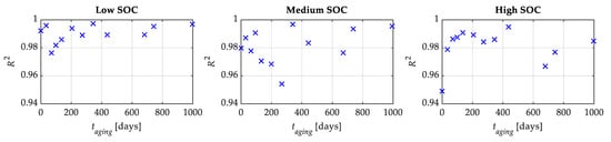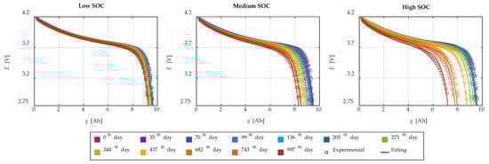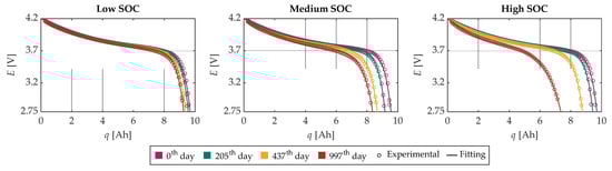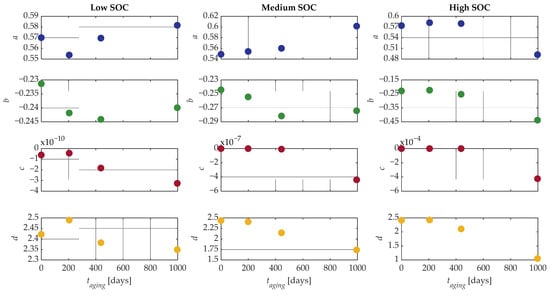 Figure 8 shows the behavior of the parameters a, b, c, and d of (2) as a function of the calendar time for the three SOC levels. From this figure, it is possible to note that, similar to the results obtained in [] for cycle aging, the parameters a, b, and d do not present a well-defined trend as a function of the calendar time. Therefore, following the analysis performed in [], we opted to consider, for each SOC level, the values of the parameters b and d constant at their mean values obtained previously and reported in Table 2. In this way, the function of the discharge OCV-q curve becomes linear in the parameters a and c; thus, the linear least square regression method could be applied.