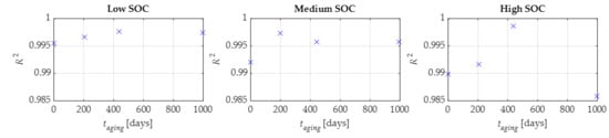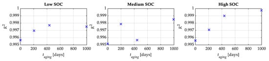 Figure 9 illustrates the comparison between the experimental OCV-q curves and the corresponding fitting functions for the four tests chosen for the characterization of the model and for each SOC level. Additionally, Figure 10 shows the related R2 values obtained by maintaining parameters b and d constant. From these figures, it is possible to recognize a good agreement between the experimental and modeled data for the low and medium SOC tests, while the agreement for the high SOC tests is a little worse. In any case, the R2 is greater than 0.985 for all the tests.
