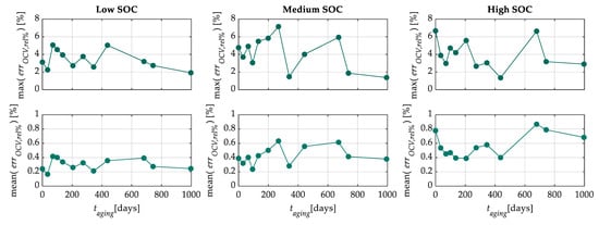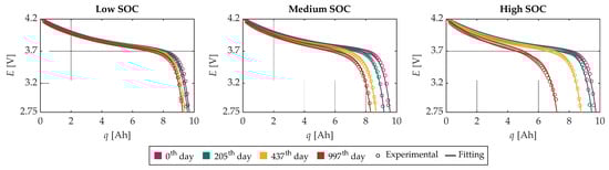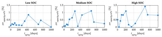 Theoretically, the minimum cut-off voltage for the battery used in this work would be 2.75 V. However, due to the elimination of the voltage drop over the internal resistance, the actual cut-off voltage was higher and depended on the amplitude of that voltage drop itself. Nonetheless, since the last experimental point of each discharge OCV-q curve is close to the minimum cut-off voltage, this experimental point was considered as Emin, and the related value of the actual battery capacity, Ca, was compared with the modeled one. Figure 16 shows the capacity percentage errors for the three SOC levels. From this figure, it is possible to recognize that the capacity error is lower than 1.5% for all the aging and SOC levels.