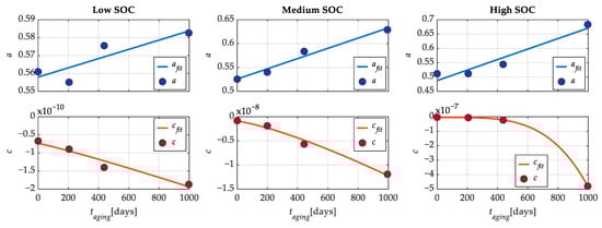 where αc, βc, and δc are the coefficients of the fitting function of the parameter c. The choice to use the expression (7) for parameter c was made to find an analytical expression that was suitable for all three SOC levels. Finally, Figure 11 shows the behavior of parameters a and c of (2) as a function of the calendar time for the three SOC levels, along with their related fitting functions. Table 3 reports the coefficients of (6) and (7). In this way, an aging model with only two parameters that depend on calendar aging was derived.