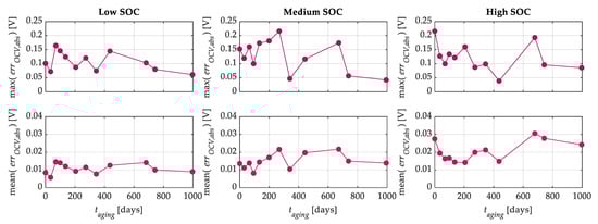 Figure 12 shows the maximum and mean values of the relative percentage error of the OCV-q curves as a function of calendar aging. From this figure, it is possible to note that the highest maximum relative percentage errors are about 5%, 7%, and 6.5% for the low, medium, and high SOC tests, respectively. Instead, the mean relative percentage errors for the low, medium, and high SOC tests are lower than 0.45%, 0.65%, and 0.9%, respectively, across all calendar aging levels. On the other hand, the relative percentage error can have different weights for different states of discharge because the OCV curve changes as a function of q. For this reason, Figure 13 shows the maximum and mean values of the absolute error. The maximum value of the latter is about 165 mV for the low SOC tests and 220 mV for the medium and high SOC tests, while the mean values of the absolute error are lower than 15 mV, 22 mV, 30 mV for the low, medium, and high SOC tests, respectively, across all aging levels. Finally, Figure 14 reports the experimental OCV-q curves compared with the ones obtained through the proposed model for all tests and SOC levels, while Figure 15 shows the related R2. The latter are larger than 0.9763, 0.9542, and 0.9490 for the low, medium, and high SOC tests, respectively.