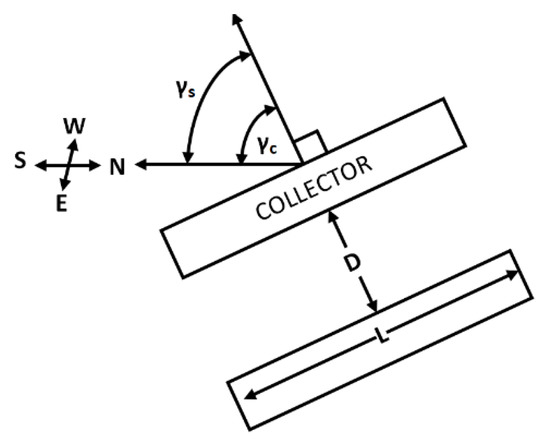 Collectors oriented toward the southwest at angle , with respect to the south, are shown in Figure 2, where the direction of is normal to the collector. The criteria for which the inter-row spacing is defined is when . The sun azimuth angle is related to the sun declination angle , to the sun hour angle , and to the sun altitude angle by [1]).
