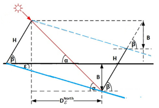 The inter-row spacing for “no shading” (shadow height , Equation (1)), therefore, becomes