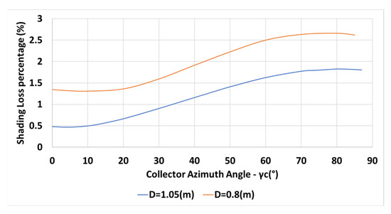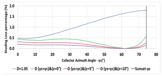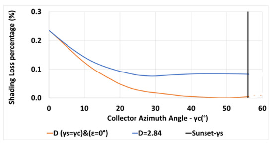 The variation of the annual shading losses percentage with collector azimuth angle for m, , m, N, and for a constant inter-row spacing is depicted in Figure 5 (orange line).