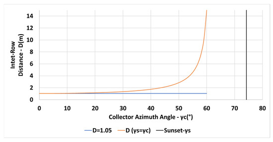 Variation of the inter-row spacing D with collector azimuth for , N, constant m (in blue), for (in orange) see (Equations (6) and (13)).