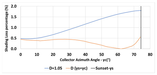 The variation of the inter-row spacing with the collector azimuth angle is depicted in Figure 10 for a constant spacing m (in blue—Equation (6)) and for the spacing criterion (in orange—Equation (13)). The vertical black line indicates the sunset azimuth angle on day December 21. Figure 11 describes the shading losses percentage as a function of the collector azimuth for a constant spacing m (in blue) and for a spacing criterion (in orange). Less shading losses may be obtained by applying the criteria .