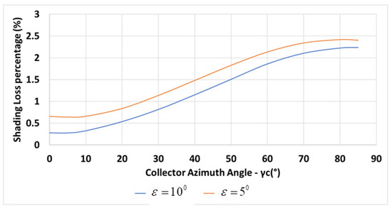 The inter-row spacing for collectors deployed on inclined planes facing north is longer than for collectors deployed on horizontal planers [18]; therefore, the inter-row spacing, in this section, is determined by Equation (6) for winter solstice at solar noon, and , i.e., m. Figure 17 shows the variation of the percentage of the annual shading losses with the collector azimuth for m, , m, N, and for a constant inter-row spacing m, for two plane inclination angles, and . The figure shows that a larger inclination angle results in less shading.