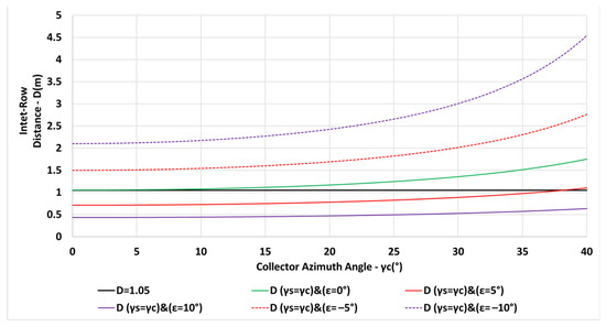 To indicate the effect of the azimuth angle on the inter-row spacing and shading in a totally different geographical location, this study investigated the deployment of collectors at Lindenberg, Germany; latitude N; longitude E, based on solar radiation data from Meteorologisches Observatorium Lindenberg, Richard Aßmann Observatorium, PANGAEA, Monitoring station no.12, https://dataportals.pangaea.de/bsrn/?q=LR1300 (accessed on 1 January 2019); ten minutes of solar radiation data, the year 2006. The assumed lower limit for the inter-row spacing, in this study, is dictated by the maintenance requirement of m. The assumed range for the collector azimuth angles is from to , relative to the south for latitude N and from to for latitude N. For comparison, the assumed collector inclination angle for both latitudes is . The value of the upper limit of the inter-row spacing depends on the differently applied criteria for the inter-row spacing.