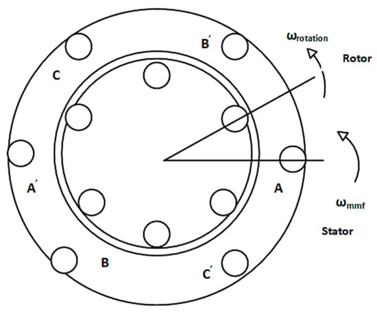 The DFIG can be utilised to generate and supply electrical power at a constant frequency. Figure 1 [56] depicts a working induction machine basic theory of the interface between the stator side and rotor side magneto motive forces (MMF). The stator side winding currents initiate an MMF revolving at grid frequency, generating an MMF in the rotor side windings. The so-called slip frequency will spin this induced rotor MMF with the following value [30]: The rotor speed does not attain the stator side MMF.