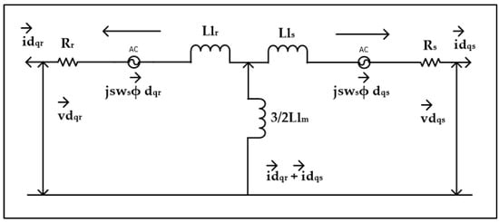 Figure 2 [57] shows the DFIG’s corresponding circuit in the d-q frame of reference. It is possible to assume the electrical modelling of the DFIG in the d-q frame of reference. Here are the equations for the voltage, flux, and power of the rotor side and grid side converters for DFIG-based wind energy systems that may be expressed in the d-q frame of reference [58].