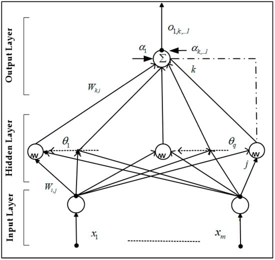 where yi is the output definition, and φ is an excitation function that considers the neurons’ nonlinear behaviour. The commonly used functions are an S-shaped tangent function (tansig), an S-shaped logarithmic function (logsig) and a purely linear function (purelin). The output layer of neurons executes related controls, and in this example, the kth output ok is as follows [66]: