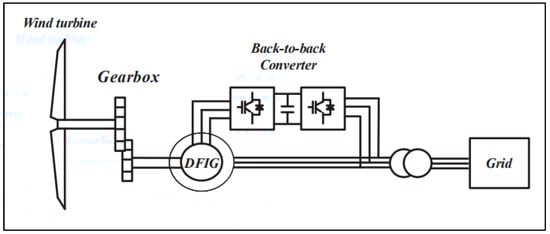 The doubly fed induction generator connected to the power grid has been widely used in the wind-driven turbine energy conversion system. It reaped benefits on independent active and reactive power regulation because of its variable speed and constant frequency characteristics [24,25]. When the stator is connected directly to the grid, the DFIG is vulnerable to grid failures, significantly when the voltage decreases, causing voltage sag and the stator current changes [26,27]. The stator of grid-tied DFIGs is directly connected to the grid using grid-side converters (GSCs), which control dc-link voltage [24]. In contrast, rotor side converters (RSCs) regulate generator speed and reactive power [25].