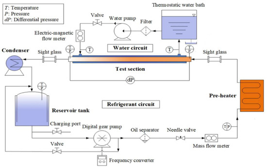 An experimental process was carried out on a high-precision test rig that can use various refrigerants (i.e., R410A, R32, R22, etc.) and can perform single-phase, condensation, and evaporation heat transfer performance tests on various types of heat exchange tubes. The test rig is able to test circular tubes, rectangular channel tubes, internally enhanced tubes, and three-dimensional tubes with outer tube diameters (OD) ranging from 6 mm to 19 mm. Various experimental conditions can be controlled: (i) inlet and outlet vapor qualities (0 to 1); (ii) refrigerant mass flow rate (10 kg/h to 300 kg/h); (iii) boiling conditions ranging from 5 °C to 15 °C; and (iv) condensation conditions ranging from 35 °C to 45 °C. The schematic diagram of the test setup is shown in Figure 1 and comprises a main refrigerant loop with three auxiliary loops.